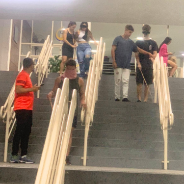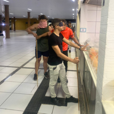 Os discentes passaram pelos corredores; aprenderam como funciona o piso tátil; passaram pela recepção; exploraram o mapa da instituição disponibilizado em braile; subiram e desceram escadas e rampas; e utilizaram banheiros e bebedouros. Em seguida, exploraram o ambiente da biblioteca, onde tiveram acesso a livros em braile e fones de ouvido, e com a atividade ainda em prática, passaram pela Praça de Alimentação.