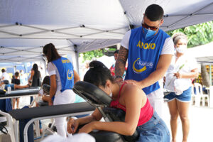 O público teve acesso a serviços, tais como: tempo de sangria, recreação, esfoliação da pele e orientações sobre cuidados, aferição da pressão arterial, orientações ergonômicas, atividades lúdicas para crianças.